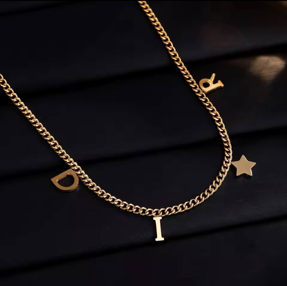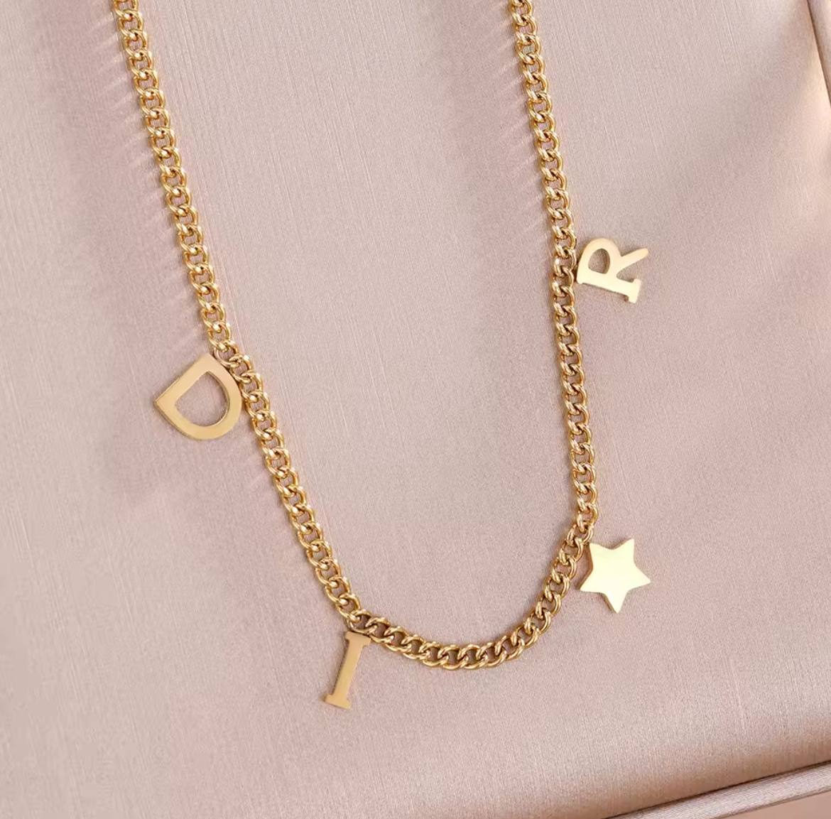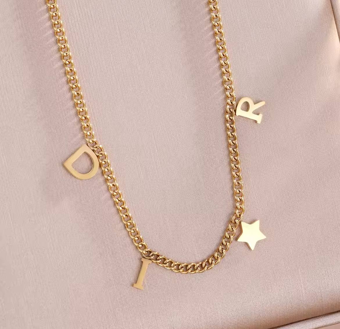 طراحی: زنجیر کارتیه ظریف که با آویزهای حروف و ستاره تزئین شده است.
